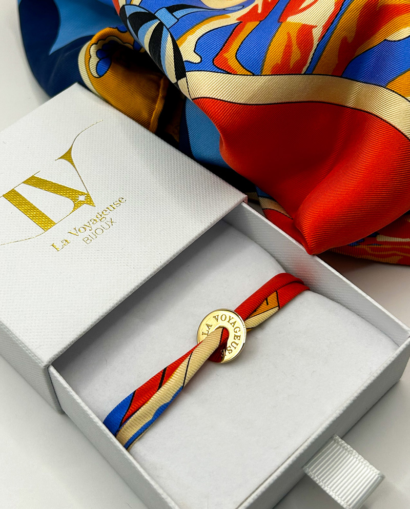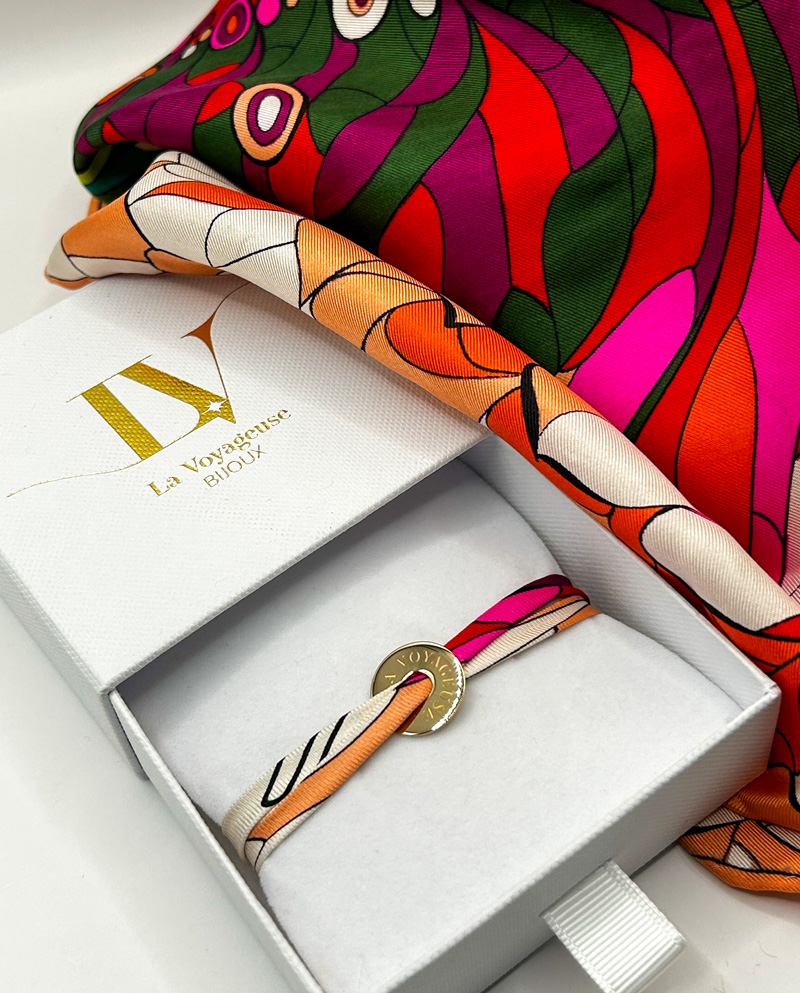 Audace et énergie, ce bracelet double tour en soie upcyclée aux couleurs pétillantes apporte fun et style unique à votre poignet, médaille Argent 925 La Voyageuse ou personnalisée