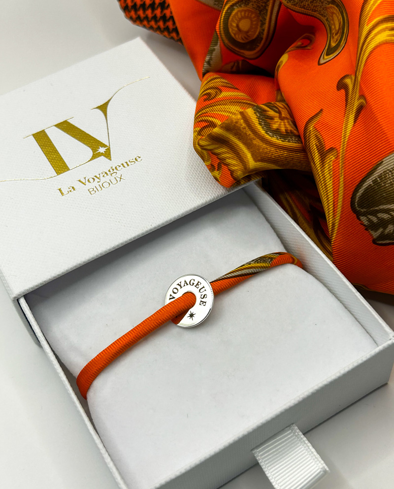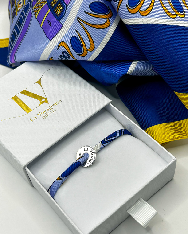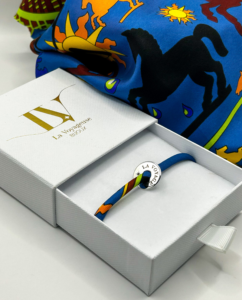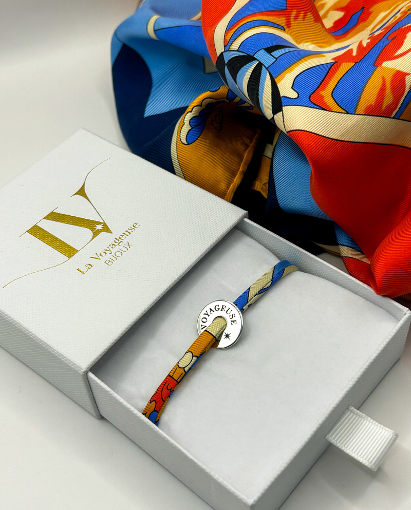 Audace, un bracelet en soie upcyclée aux couleurs vibrantes, sublimé par une médaille en argent massif La Voyageuse ou personnalisée. 5 styles, chaque bracelet est unique !