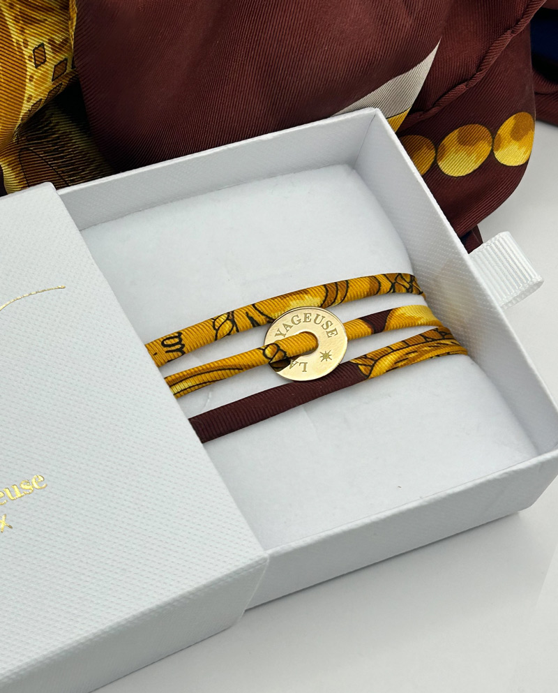 Un bijou modulable en soie vintage issue d’un foulard de grande maison, sublimé par une médaille plaqué or, signature La Voyageuse.