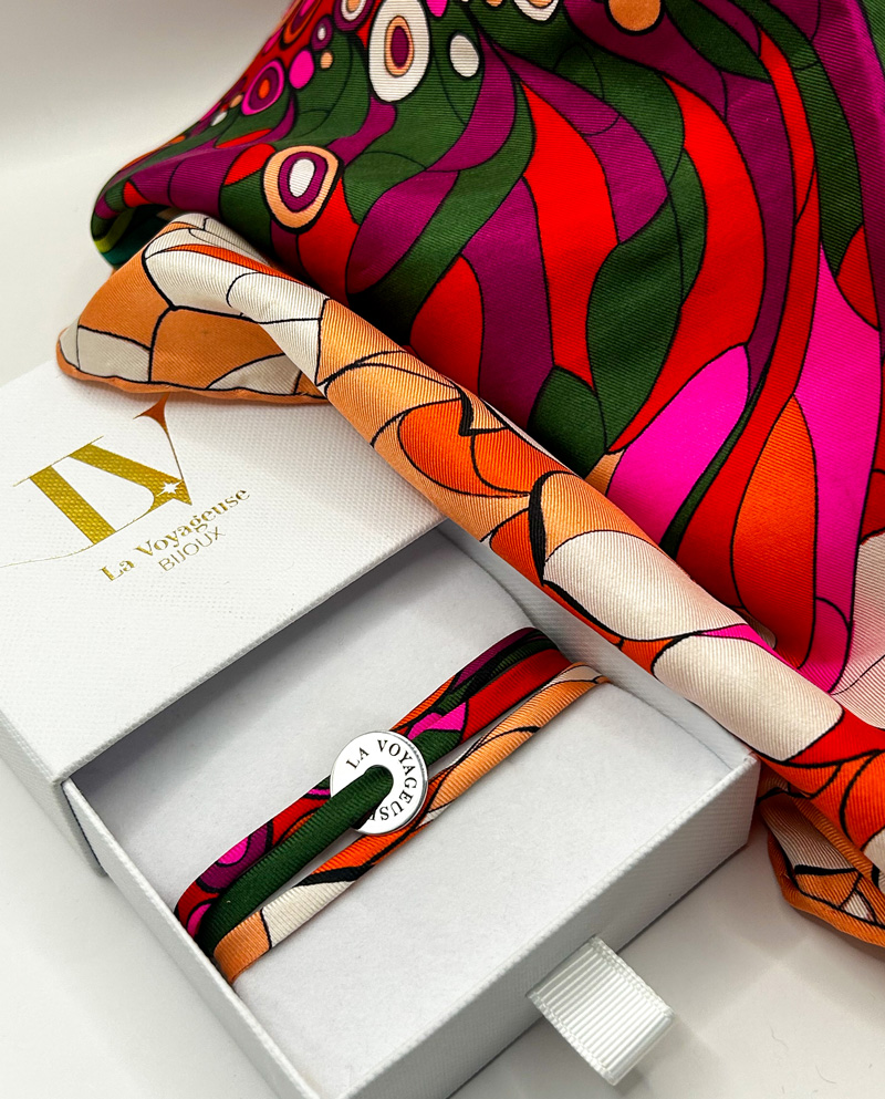 Charme coloré et moderne : ce bracelet triple tour en argent massif 925 illumine le poignet avec ses couleurs vibrantes et son design contemporain. Monté à la main dans mon atelier, je transforme des foulards en soie en bijoux uniuqes … Cette collection allie élégance, modernité et matières upcyclées pour un bijou unique, jeune et audacieux.
