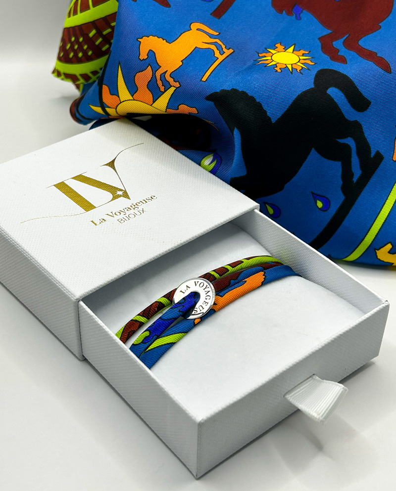 Charme modulable et coloré, ce bracelet triple tour en soie upcyclée et médaille La Voyageuse argent massif 925peut etre porté en bracelet ou collier. Chaque modèle est créé avec une soie choisie pour son énergie et sa personnalité.