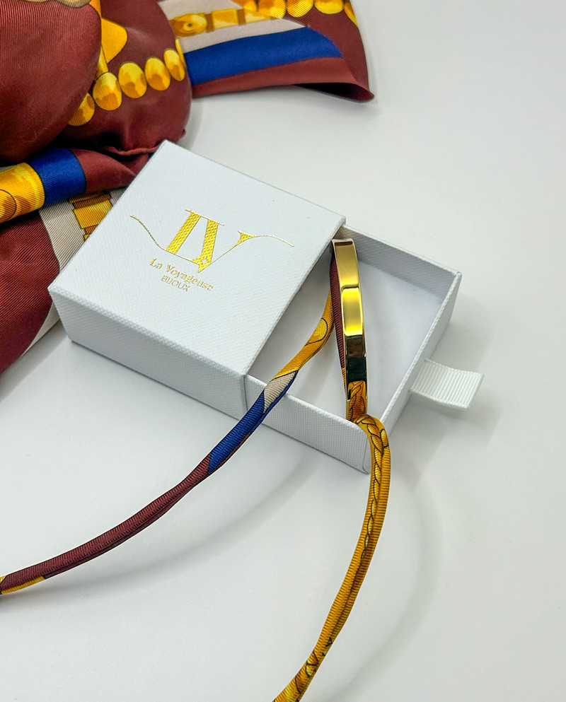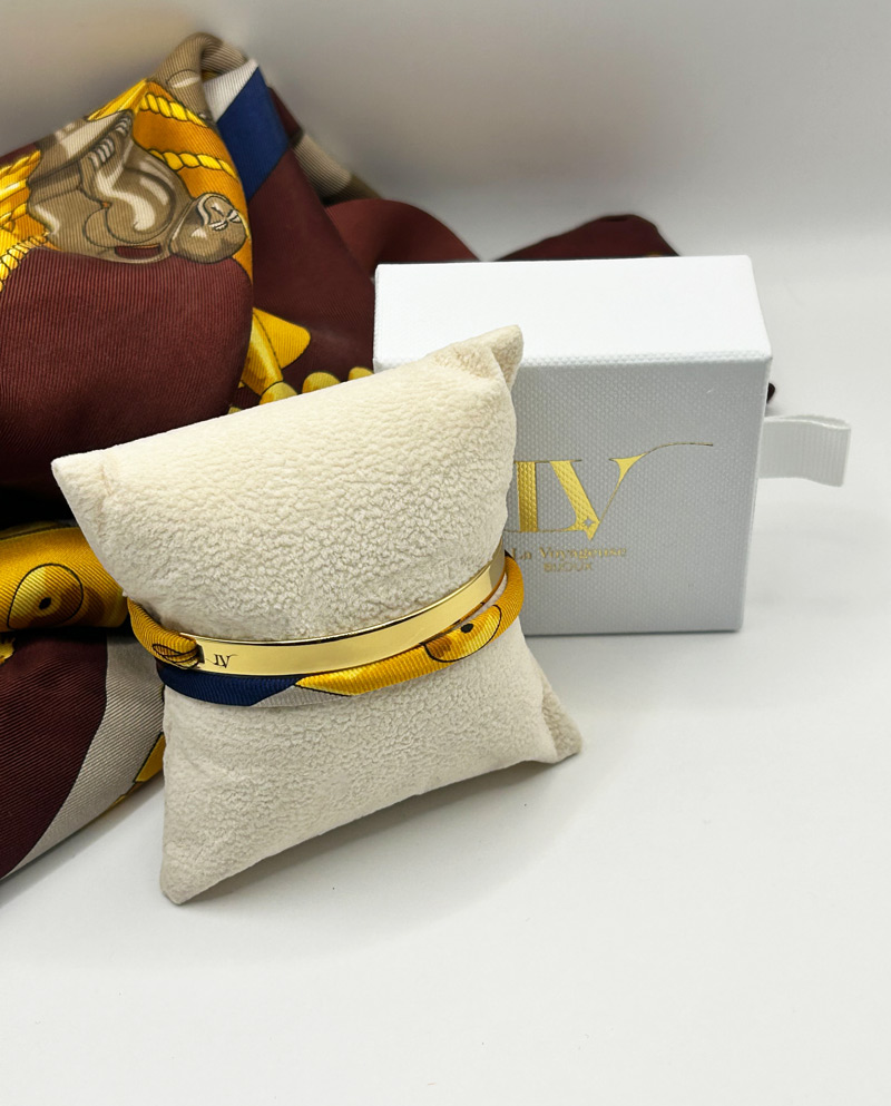 Adoptez un bijou unique ! Ce bracelet manchette 6mm est doré à l’or 24K et mélange ruban en soie fabriqué à partir d’un foulard vintage de grande maison, aux motifs inspirés des cultures du monde, entre héritage et élégance.